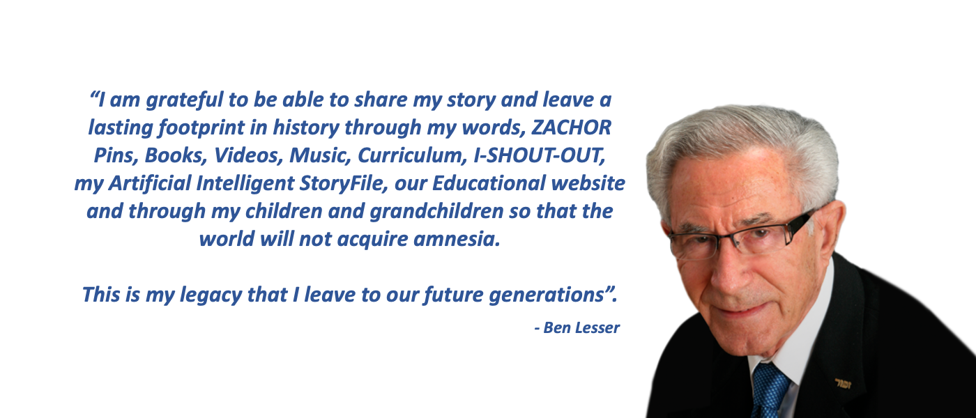 Over the years, ZACHOR has grown to accommodate the ever-changing world that we live in. Thus, ZACHOR expanded its educational programs with Ben’s curriculum-based autobiography, “Living a Life That Matters, From Nazi Nightmare to American Dream,” and a newly developed, first-ever online curriculum taught by a survivor—ZACHOR Holocaust Curriculum, which over 500+ schools worldwide are utilizing. Outreach is the helm of our organization and continues to evolve through our “Generation Now” campaign, engaging and encouraging survivors of all ages to order and wear their pins proudly. And lastly, the future of ZACHOR is teaching tolerance by advocating change through the I-SHOUT-OUT.org, an anti-hate movement with a mission to put an end to intolerance by speaking up and out for those who cannot.